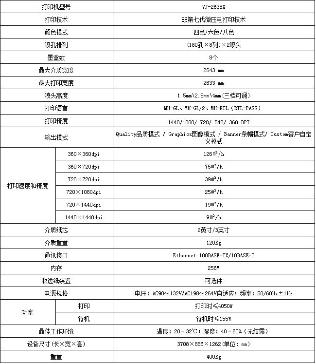 ? 最大打印寬度2,633mm,最高打印速度四色99平米/小時,六色、八色52平米/小時;